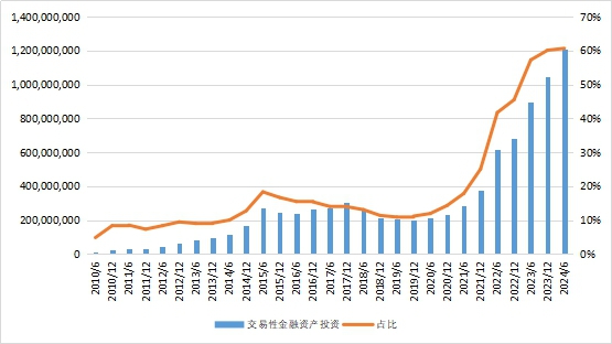 2024年2季度末,资金信托中,交易性金融资产投资规模达到12.10万亿元,占比为60.66%。较2023年4季度末增加1.66万亿元,占比增加0.56%;与2023年同期相比,规模增加3.12万亿元,同比增速为34.68%,占比上升3.42%。同时,信托公司也在积极探索长期股权投资、债权投资、同业存放、买入返售等多样化的金融工具运用。