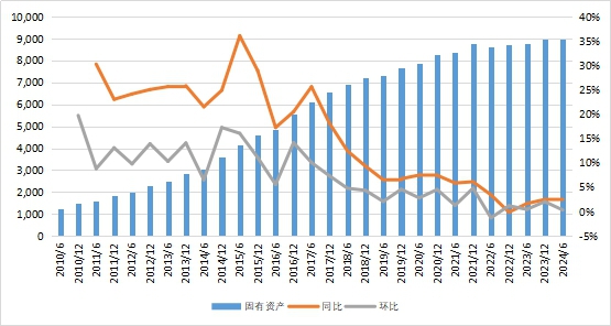 与2023年同期相比,固有资产规模有所增加。截至2024年2季度末,信托公司固有资产规模达到8987.32亿元,比2023年4季度末增加27.92亿元;与2023年同期相比,规模增加206.33亿元,同比增速2.35%。