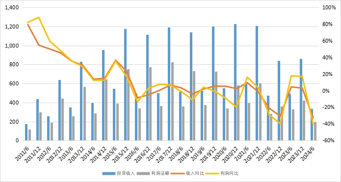 经营收入和利润总额方面,与2023年同期相比,均出现明显下滑。截至2024年2季度末,行业实现经营收入332.53亿元,同比下降32.73%;利润总额195.88亿元,同比下降40.63%。